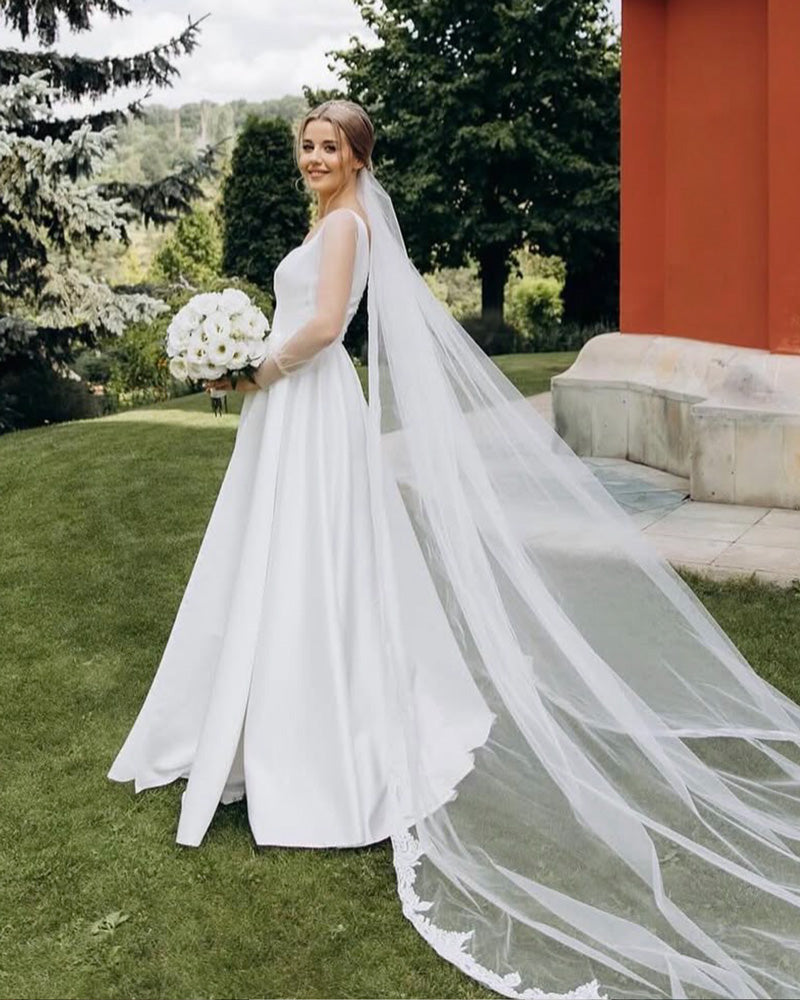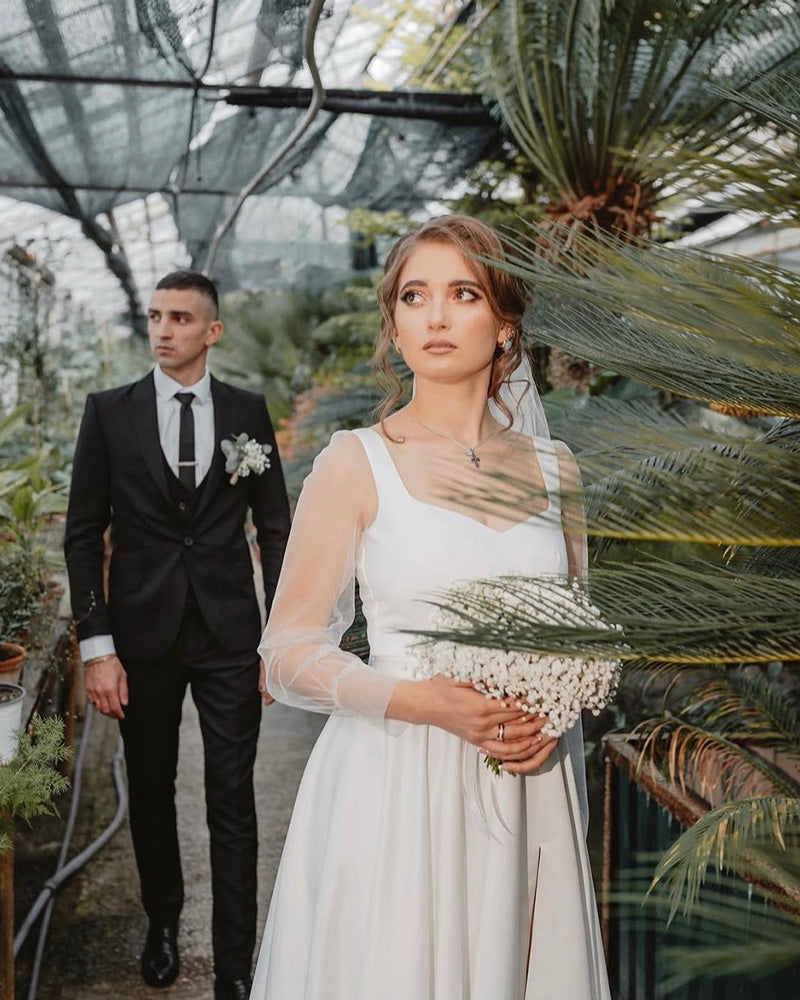 Rochie de mireasa clasica, decolteu patrat, maneci lungi