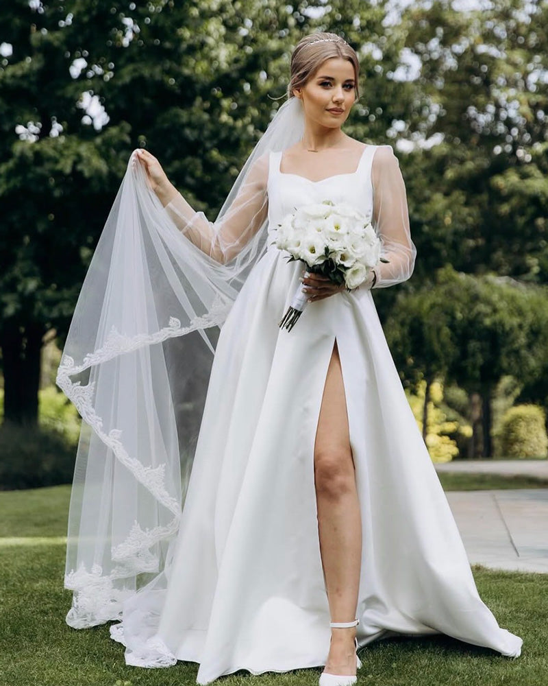 Rochie de mireasa alba lunga eleganta din satin cu slit, mâneci lungi